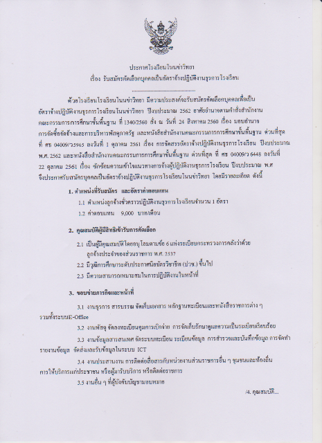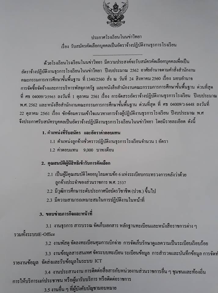 โรงเรียนโนนข่าวิทยารับสมัครคัดเลือกบุคคลเป็นอัตราจ้างปฏิบัติงานธุรการโรงเรียน