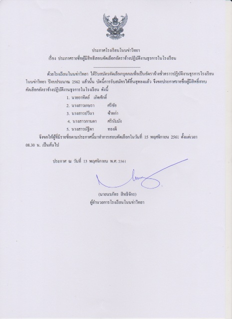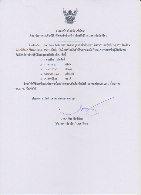 วันที่ 13 พฤศจิกายน 2561 ประกาศรายชื่อผู้มีสิทธิสอบคัดเลือกอัตราจ้างปฏิบัติงานธุรการในโรงเรียนโนนข่า