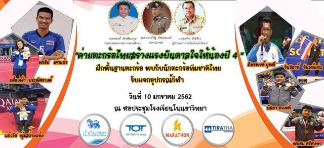 วันที่10มกราคม2562ขอเชิญร่วมกิจกรรม "ค่ายตะกร้อไทยสร้างเเรงบันดาลใจให้น้องปี4" ฝึกพื้นฐานตะกร้อ พบกับนักตะกร้อทีมชาติไทย รับเเจกอุปกรณ์กีฬา ณ หอประชุมโรงเรียนโนนข่าวิทยา