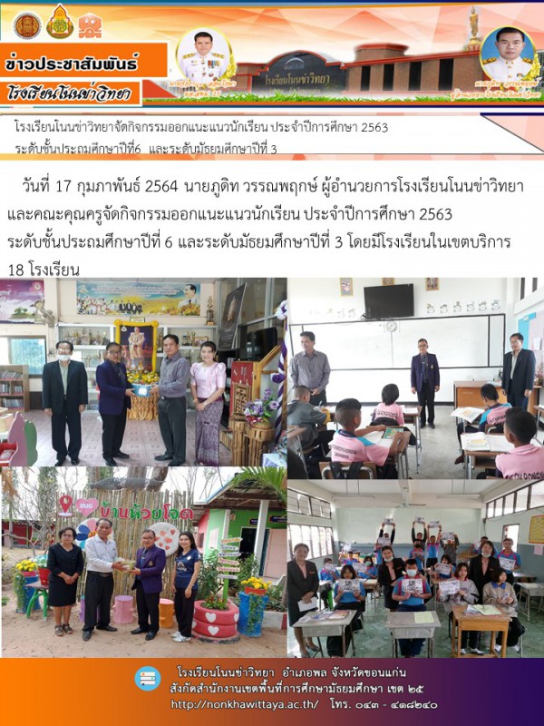วันที่ 17 กุมภาพันธ์ 2564 นายภูดิท วรรณพฤกษ์ ผู้อำนวยการโรงเรียนโนนข่าวิทยา และคณะคุณครูจัดกิจกรรมออกแนะแนวนักเรียน ประจำปีการศึกษา 2563 ระดับชั้นประถมศึกษาปีที่ 6 และระดับมัธยมศึกษาปีที่ 3 โดยมีโรงเรียนในเขตบริการ 18 โรงเรียน