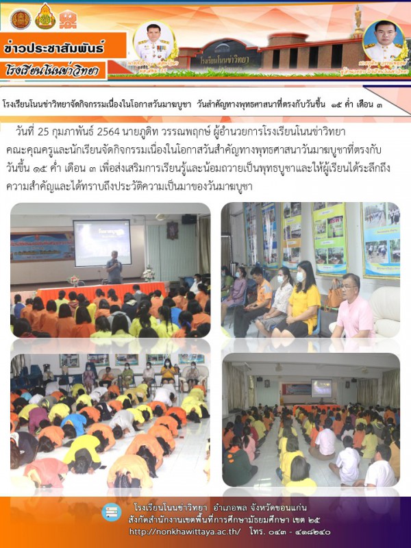 วันที่ 25 กุมภาพันธ์ 2564 นายภูดิท วรรณพฤกษ์ ผู้อำนวยการโรงเรียนโนนข่าวิทยา คณะคุณครูและนักเรียนจัดกิจกรรมเนื่องในโอกาสวันสำคัญทางพุทธศาสนาวันมาฆบูชาที่ตรงกับ วันขึ้น ๑๕ ค่ำ เดือน ๓ เพื่อส่งเสริมการเรียนรู้และน้อมถวายเป็นพุทธบูชาและให้ผู้เรียนได้ระลึกถึง