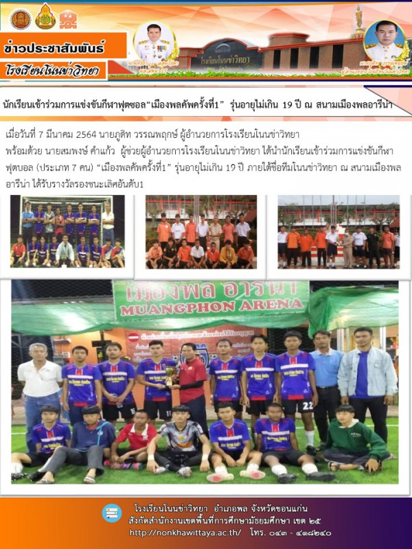 ฟุตบอล (ประเภท 7 คน) “เมืองพลคัพครั้งที่1” รุ่นอายุไม่เกิน 19 ปี ภายใต้ชื่อทีมโนนข่าวิทยา ณ สนามเมืองพลอารีน่า ได้รับรางวัลรองชนะเลิศอันดับ1