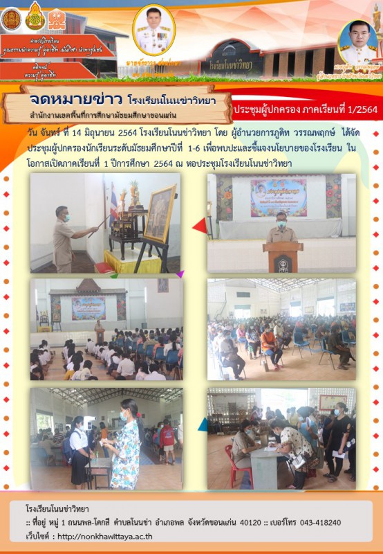 วัน จันทร์ ที่ 14 มิถุนายน 2564 โรงเรียนโนนข่าวิทยา โดย ผู้อำนวยการภูดิท วรรณพฤกษ์ ได้จัดประชุมผู้ปกครองนักเรียนระดับมัธยมศึกษาปีที่ 1-6 เพื่อพบปะและชี้แจงนโยบายของโรงเรียน ในโอกาสเปิดภาคเรียนที่ 1 ปีการศึกษา 2564 ณ หอประชุมโรงเรียนโนนข่าวิทยา