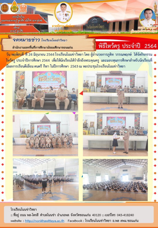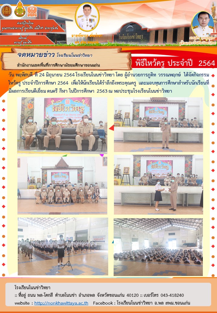 วัน พฤหัสบดี ที่ 24 มิถุนายน 2564 โรงเรียนโนนข่าวิทยา โดย ผู้อำนวยการภูดิท วรรณพฤกษ์ ได้จัดกิจกรรมไหว้ครู ประจำปีการศึกษา 2564 เพื่อให้นักเรียนได้รำลึกถึงพระคุณครู และมอบทุนการศึกษาสำหรับนักเรียนที่มีผลการเรียนดีเยี่ยม ดนตรี กีฬา ในปีการศึกษา 2563 ณ หอประชุมโรงเรียนโนนข่าวิทยา |
