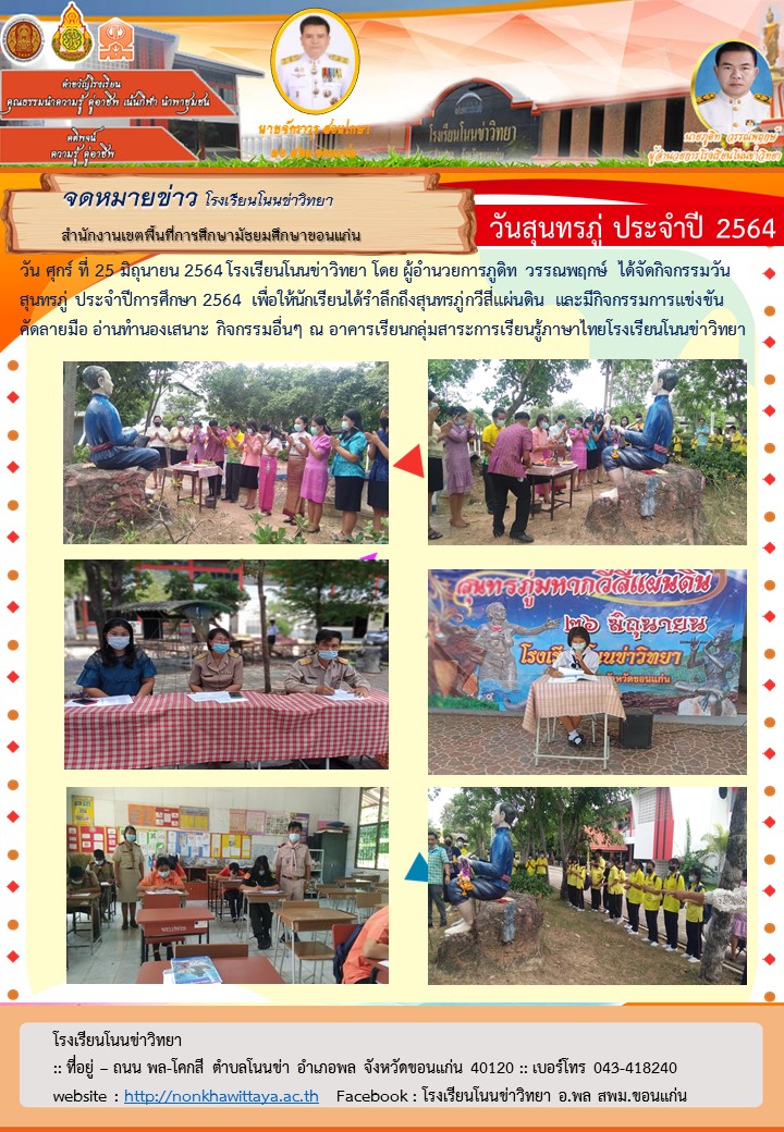 วัน ศุกร์ ที่ 25 มิถุนายน 2564 โรงเรียนโนนข่าวิทยา โดย ผู้อำนวยการภูดิท วรรณพฤกษ์ ได้จัดกิจกรรมวันสุนทรภู่ ประจำปีการศึกษา 2564 เพื่อให้นักเรียนได้รำลึกถึงสุนทรภู่กวีสี่แผ่นดิน และมีกิจกรรมการแข่งขันคัดลายมือ อ่านทำนองเสนาะ กิจกรรมอื่นๆ ณ อาคารเรียนกลุ่มสาระการเรียนรู้ภาษาไทย โรงเรียนโนนข่าวิทยา