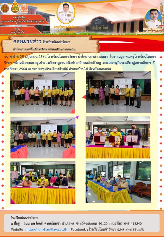 วัน ศุกร์ ที่ 25 มิถุนายน 2564 โรงเรียนโนนข่าวิทยา นำโดย นางสาวลัดดา โบราณมูล คุณครูโรงเรียนโนนข่าวิทยา พร้อมด้วยคณะครูเข้าร่วมศึกษาดูงาน เพื่อขับเคลื่อนหลักปรัชญาของเศรษฐกิจพอเพียงสู่สถานศึกษา ปีการศึกษา 2564 ณ หอประชุมโรงเรียนบ้านไผ่ อำเภอบ้านไผ่ จังหวัดขอนแก่น