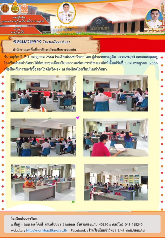 วัน พฤหัสบดี ที่ 1 กรกฎาคม 2564 โรงเรียนโนนข่าวิทยา โดย ผู้อำนวยการภูดิท วรรณพฤกษ์ และคณะคุณครู ได้จัดประชุมเพื่อเตรียมความพร้อมการเรียนออนไลน์ ตั้งแต่วันที่ 1-16 กรกฎาคม 2564 เพื่อป้องกันการแพร่เชื้อของโรคโควิด-19 ณ ห้องโสตทัศนศึกษา