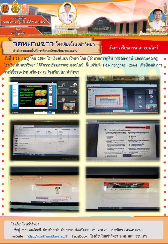 วันที่ 1-16 กรกฎาคม 2564 โรงเรียนโนนข่าวิทยา โดย ผู้อำนวยการภูดิท วรรณพฤกษ์ และคณะคุณครูโรงเรียนโนนข่าวิทยา ได้จัดการเรียนการสอนออนไลน์ ตั้งแต่วันที่ 1-16 กรกฎาคม 2564