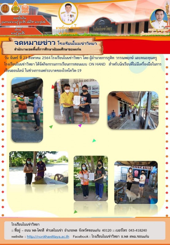วัน จันทร์ ที่ 23 สิงหาคม 2564 โรงเรียนโนนข่าวิทยา โดย ผู้อำนวยการภูดิท วรรณพฤกษ์ และคณะคุณครูโรงเรียนโนนข่าวิทยา ได้จัดกิจกรรมการเรียนการสอนแบบ ON HAND สำหรับนักเรียนที่ไม่มีเครื่องมือในการเรียนออนไลน์ ในช่วงการแพร่ระบาดของโรคโควิด-19 |