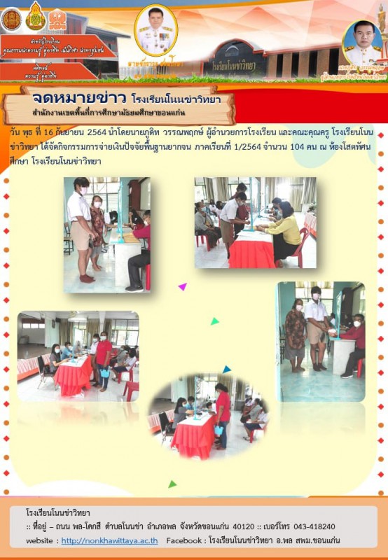 วัน พฤหัสบดี ที่ 16 กันยายน 2564 นำโดยนายภูดิท วรรณพฤกษ์ ผู้อำนวยการโรงเรียน และคณะคุณครู โรงเรียนโนนข่าวิทยา ได้จัดกิจกรรมการจ่ายเงินปัจจัยพื้นฐานยากจน ภาคเรียนที่ 1/2564 จำนวน 104 คน ณ ห้องโสตทัศนศึกษา โรงเรียนโนนข่าวิทยา |