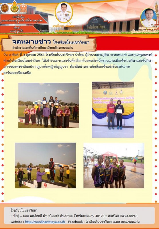 วัน อาทิตย์ ที่ 3 ตุลาคม 2564 โรงเรียนโนนข่าวิทยา นำโดย ผู้อำนวยการภูดิท วรรณพฤกษ์ และคุณครูสมพงษ์ คำแก้ว โรงเรียนโนนข่าวิทยา ได้นำนักเรียนเข้าร่วมการแข่งขันคัดเลือกตัวแทนจังหวัดขอนแก่นเพื่อเข้าร่วมกีฬาแข่งขันกีฬาเยาวชนแห่งชาติ ผลปรากฎว่า เด็กหญิงกัญญวรา ท้องถิ่น ผ่านการคัดเลือกเข้าแข่งขันระดับภาคตะวันออกเฉียงเหนือ |