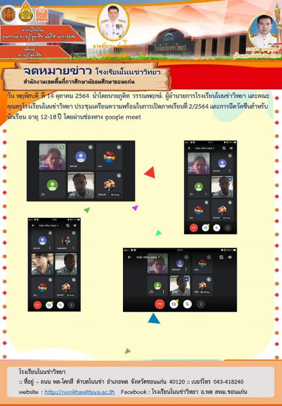 วัน พฤหัสบดี ที่ 14 ตุลาคม 2564 นำโดยนายภูดิท วรรณพฤกษ์. ผู้อำนวยการโรงเรียนโนนข่าวิทยา และคณะคุณครูโรงเรียนโนนข่าวิทยา ประชุมเตรียมความพร้อมในการเปิดภาคเรียนที่ 2/2564 และการฉีดวัคซีนสำหรับนักเรียน อายุ 12-18 ปี โดยผ่านช่องทาง google meet |