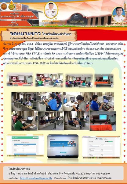 วัน พุธ ที่ 20 ตุลาคม 2564 นำโดย นายภูดิท วรรณพฤกษ์ ผู้อำนวยการโรงเรียนโนนข่าวิทยา นางจรรยา เพิ่มชีวา และนายธนายุทธ สีสุมา ได้จัดอบรมขยายผลการเข้าใช้งานเมลล์องค์กร kksec.go.th กับ obecmail.org การเข้าใช้งานระบบ PISA STYLE การจัดทำ PA และการเตรียมความพร้อมเปิดเรียน 2/2564 ให้กับคณะครูและบุคลากรทุกคนเพื่อใช้ในการติดต่อสื่อสารกับสำนักงานเขตพื้นที่การศึกษามัธยมศึกษาขอนแก่นและเพื่อเตรียมความพร้อมกับการประเมิน PISA 2022 ณ ห้องโสตทัศนศึกษาโรงเรียนโนนข่าวิทยา |