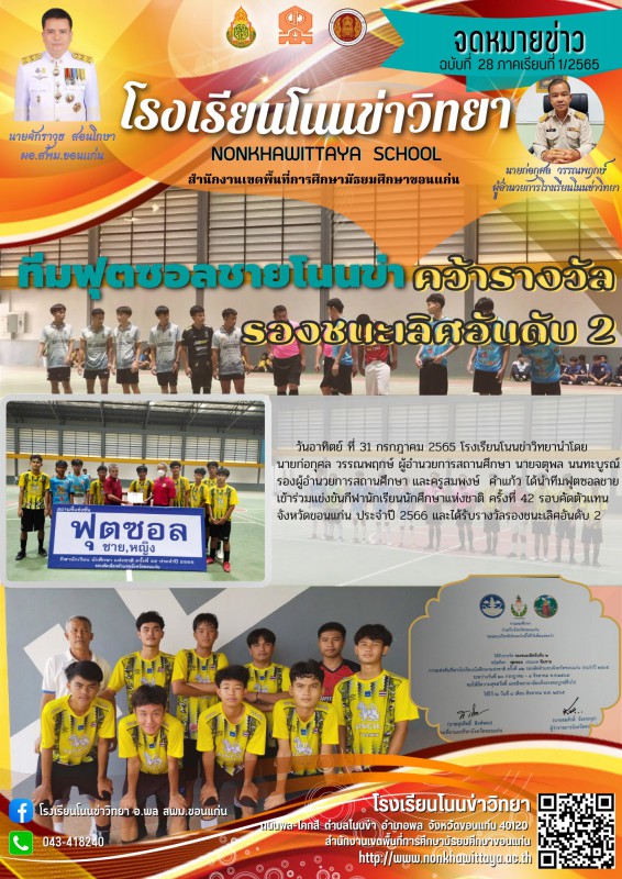 วันอาทิตย์ ที่ 31 กรกฎาคม 2565 โรงเรียนโนนข่าวิทยานำโดยนายก่อกุศล วรรณพฤกษ์ ผู้อำนวยการสถานศึกษา นายจตุพล นนทะบูรณ์ รองผู้อำนวยการสถานศึกษา และครูสมพงษ์ คำแก้ว ได้นำทีมฟุตซอลชายเข้าร่วมแข่งขันกีฬานักเรียนนักศึกษาแห่งชาติ ครั้งที่ 42 รอบคัดตัวเเทนจังหวัดขอนแก่น ประจำปี 2566 และได้รับรางวัลรองชนะเลิศอันดับ 2