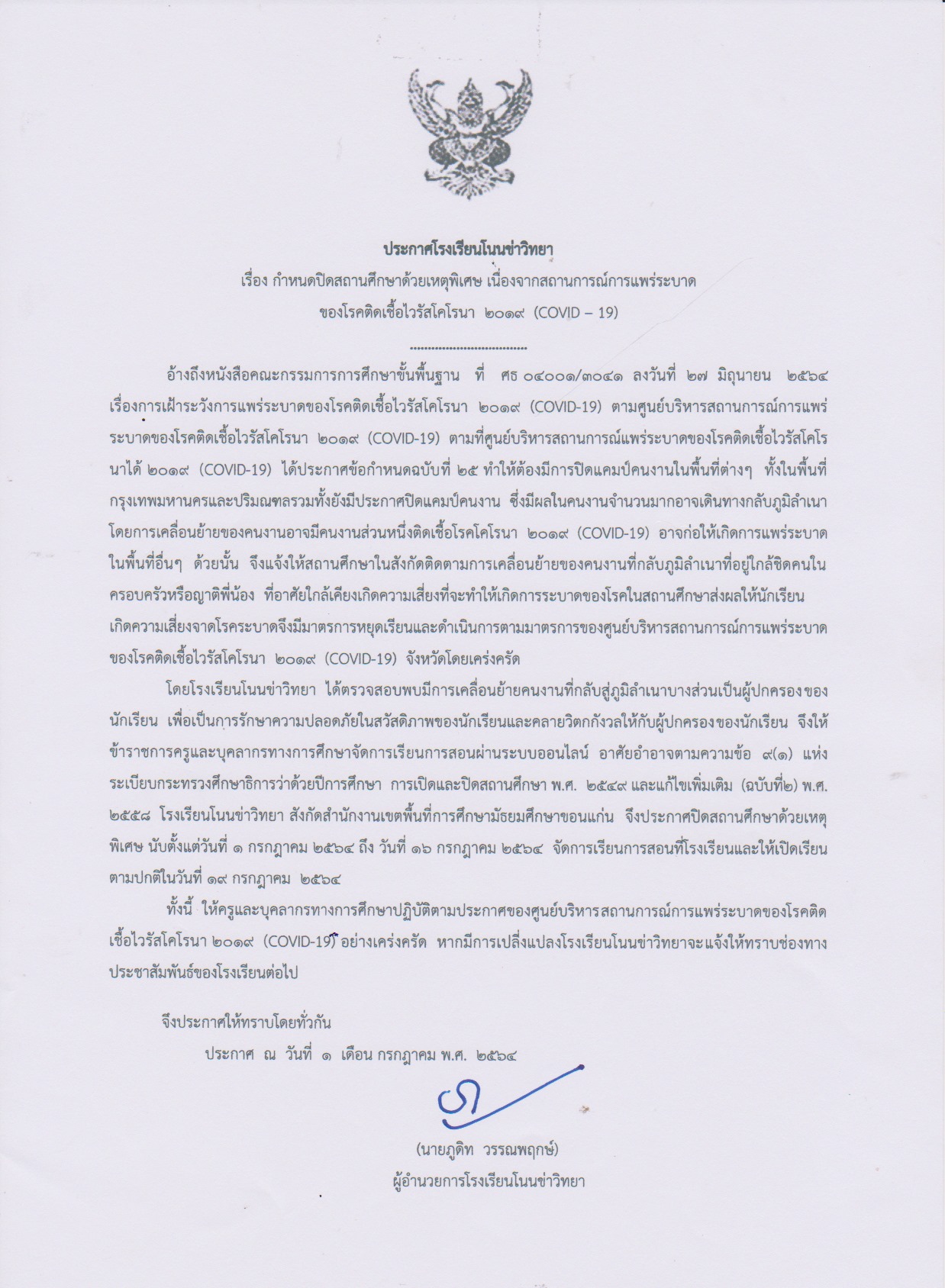 ประกาศปิดสถานศึกษาด้วยเหตุพิเศษ 1-16 กรกฎาคม 2564