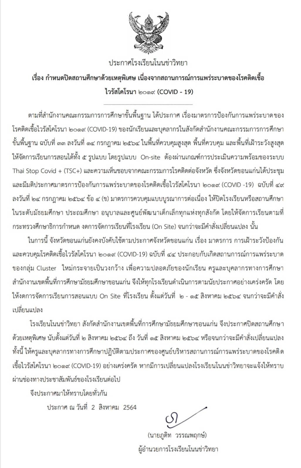 ปิดสถานศึกษาด้วยเหตุพิเศษ 2-15 สิงหาคม 2564